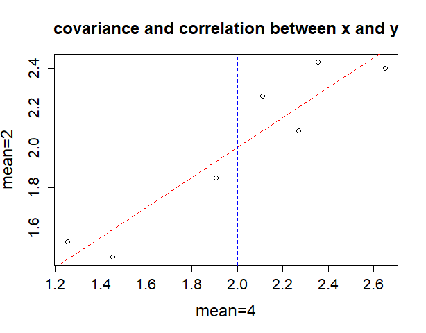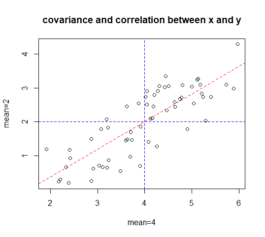 plot(d1, main="covariance and correlation between x and y", xlab="mean=4", ylab="mean=2")