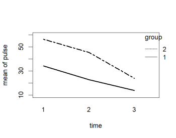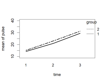+ ylab = "mean of pulse", xlab = "time", trace.label = "group"))