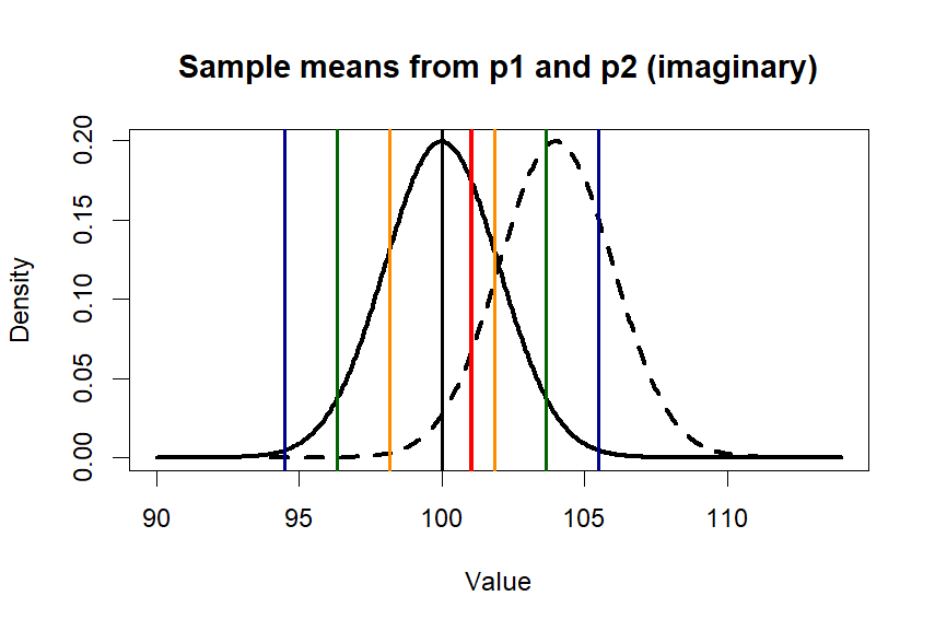 + main = "Sample means from p1 and p2 (imaginary)",