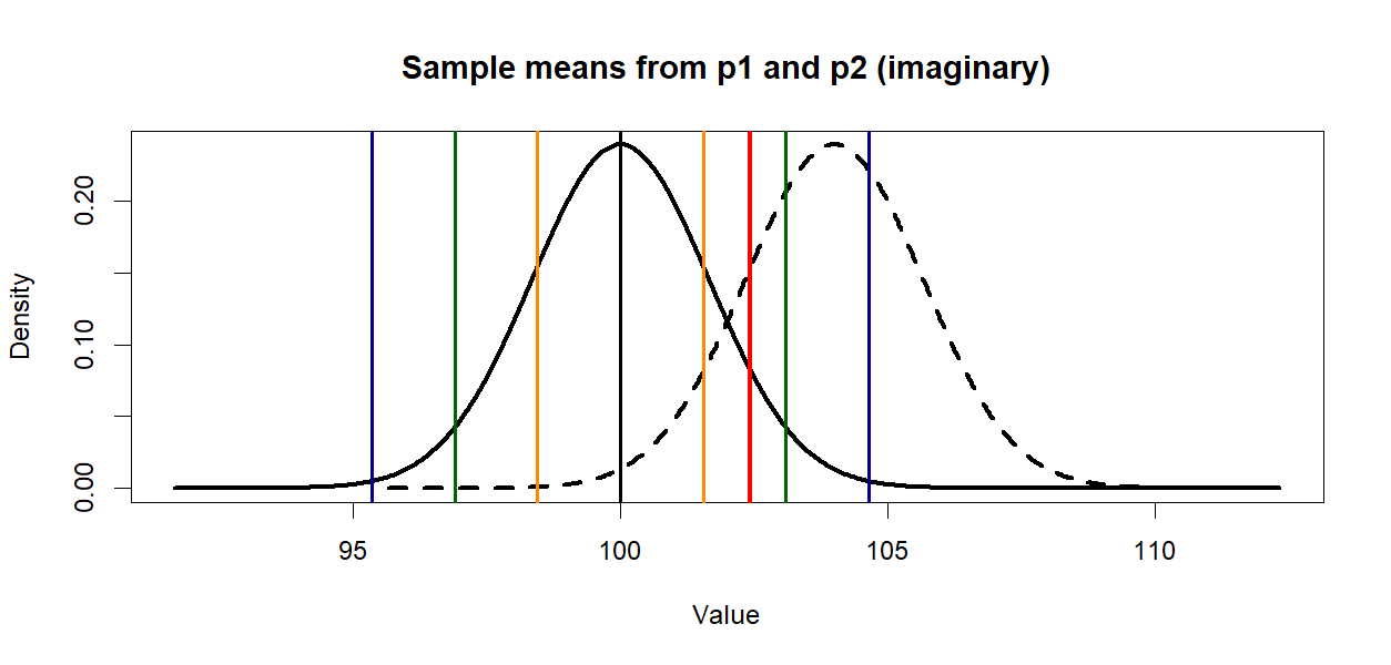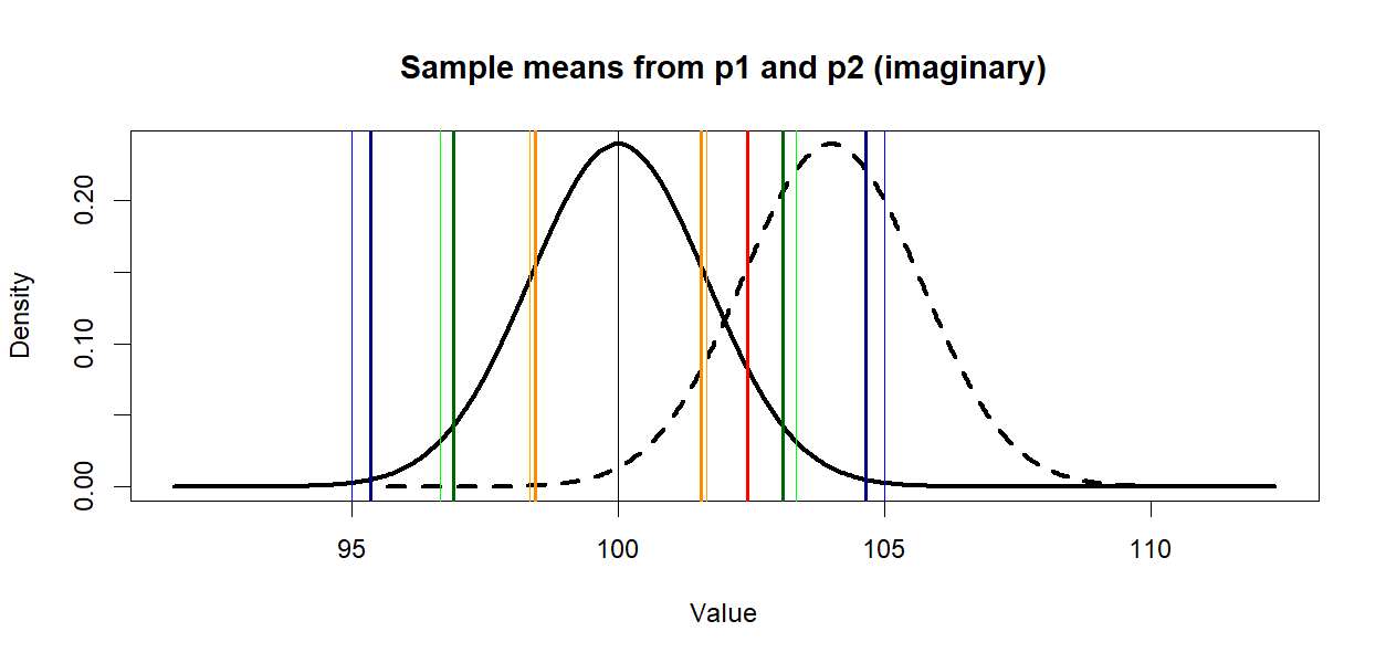 + main = "Sample means from p1 and p2 (imaginary)",