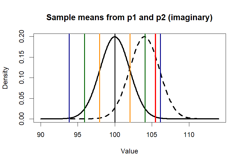 + main = "Sample means from p1 and p2 (imaginary)",
