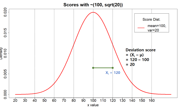 그림에서 직관적으로 보고 알 수 있듯이 분산은 그래프의 분포가 평균을 중심으로 얼마나 퍼져있는지를 (spread) 나타내주는 일종의 지표이다. 어떤 집합이 평균을 중심으로 얼마나 퍼져 있는가를 알아보기 위한 방법으로는 상식적으로 떠올릴 수 있는 것은 각 개인의 점수가 평균에서 얼마나 떨어져 있는가를 측정하여 모두 더한 후 이를 개인 수로 (number of elements) 나누는 방법을 떨올릴 수 있다. 개인의 점수가 평균에서 얼마나 떨어져 있는가를 deviation score라고 한다. 아래의 그래프는 평균이 100인 그래프를 그린 것인데, 어느 한 개인의 점수가 120이라고 하면 그 개인의 deviation score는 120-100, 즉 20이라고 할 수 있다.